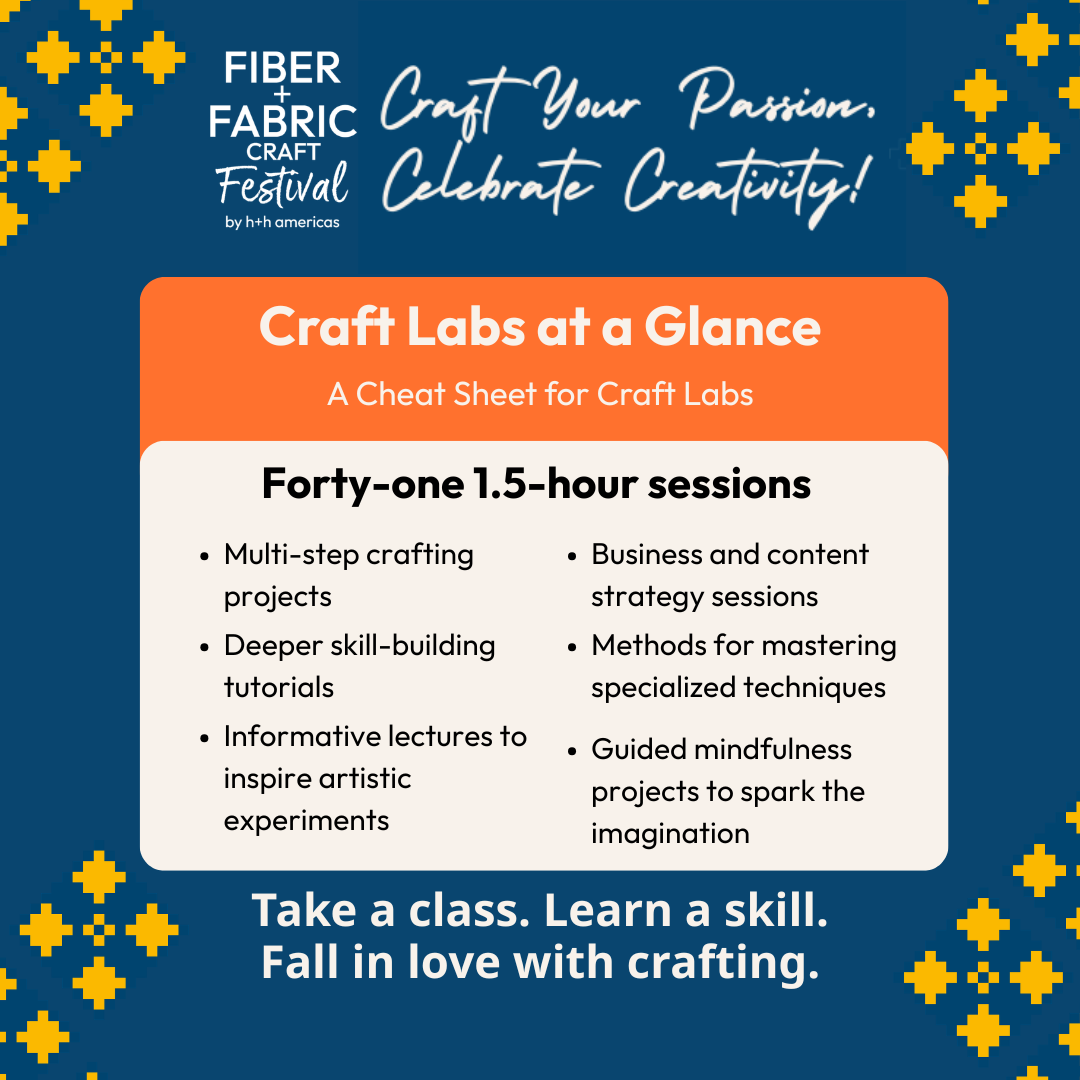 Craft Lab Overview: Crafts Labs occur on April 30, May 1, May 2, and May 3 in the mornings and afternoons. Craft Labs include more in-depth crafting projects, deeper skill-building tutorials, informative lectures, methods for mastering specialized techniques, business and content strategy, larger make & take sessions, and guided mindful meditations and projects.