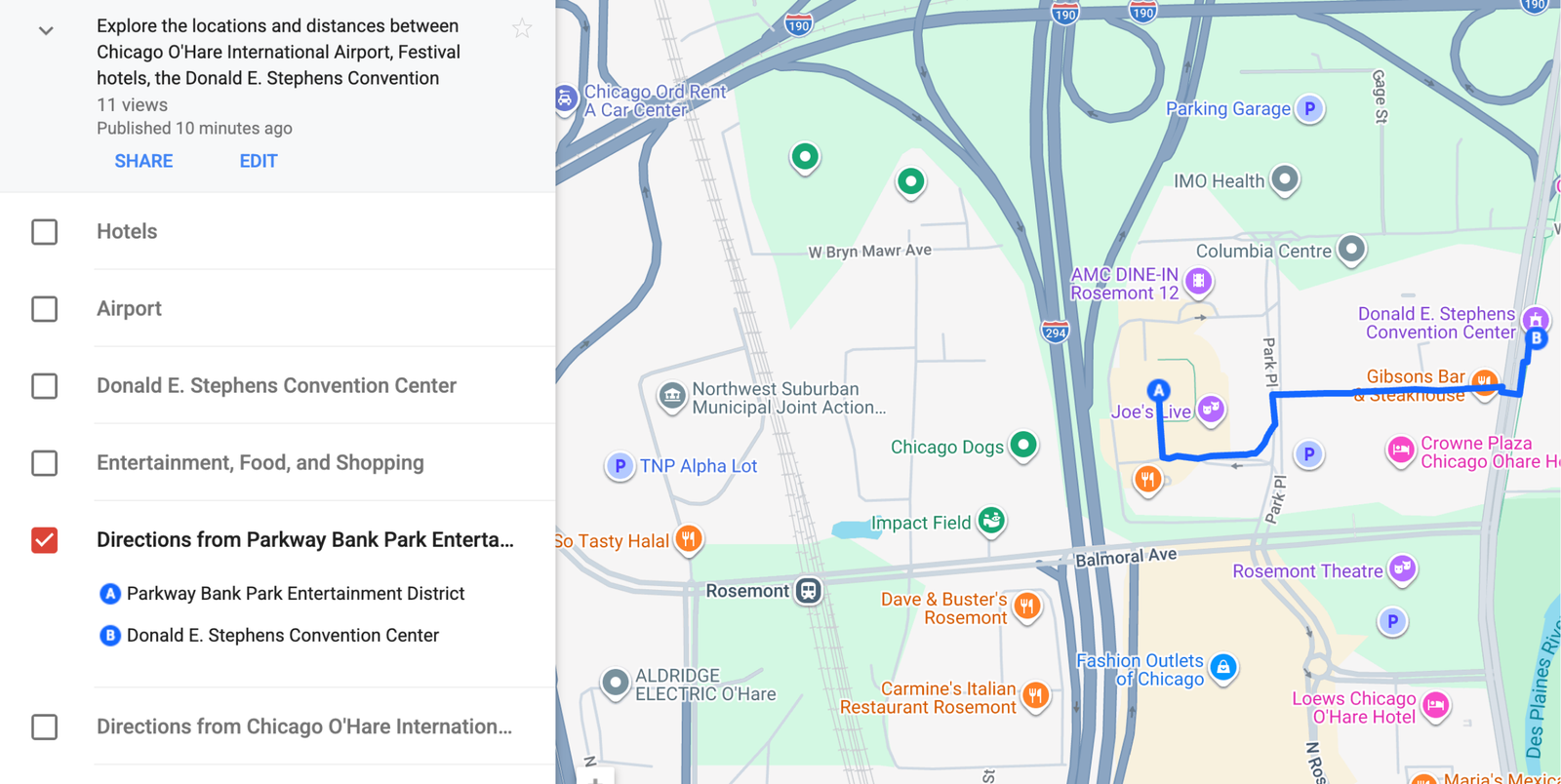It’s very easy to create walking or driving routes using our map. Let’s map the distance and route between a hotel and the Donald E. Stephens Convention Center.