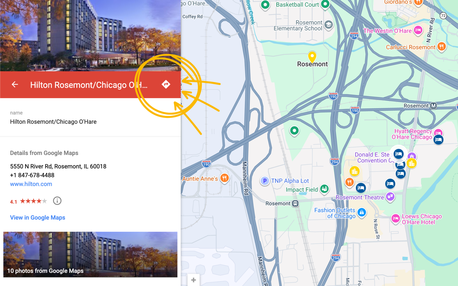 First, select your hotel. We’ve selected Hilton Rosemont Chicago O’Hare. Select the Directions icon shown next to the hotel name: