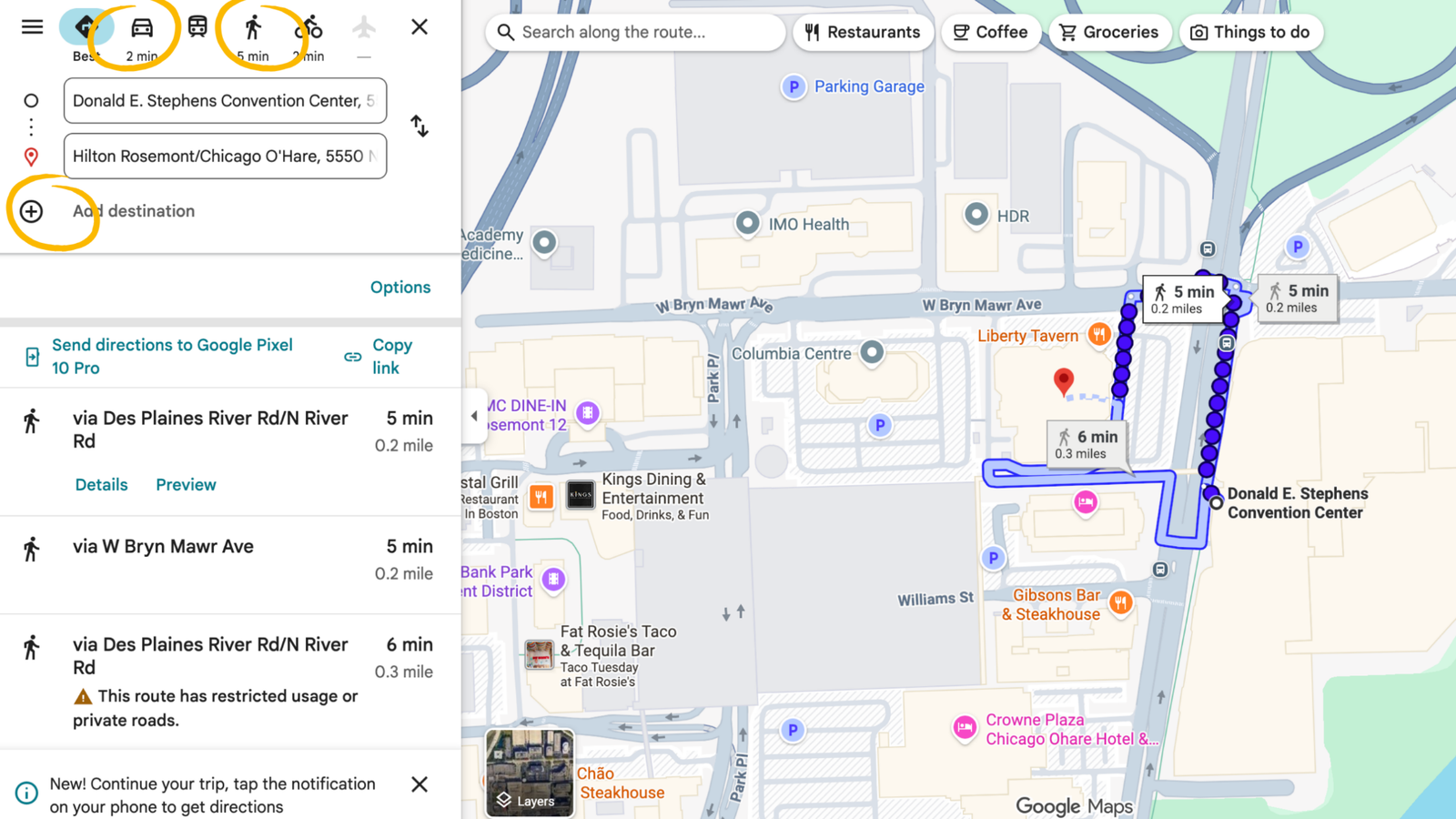 Once selected, a new window will open. Type in your second destination to map your route. Note the estimated times for both walking and driving directions, and the ability to input a third location if necessary: